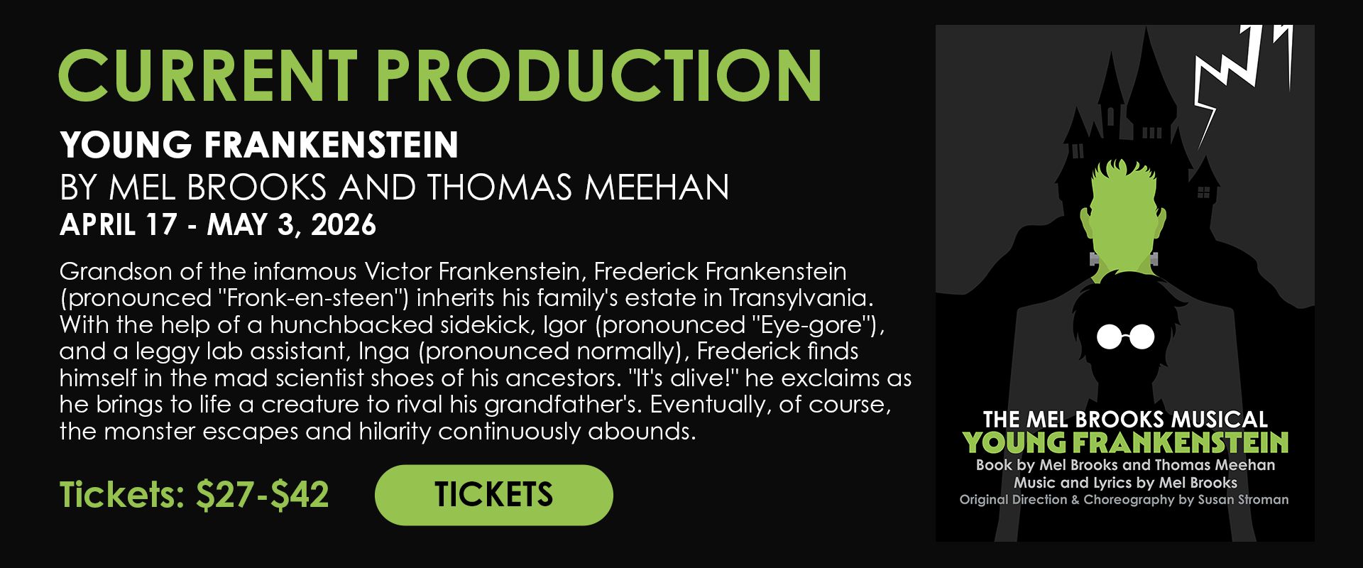 We are thrilled to present the monstrously funny musical comedy Young Frankenstein, opening April 17.